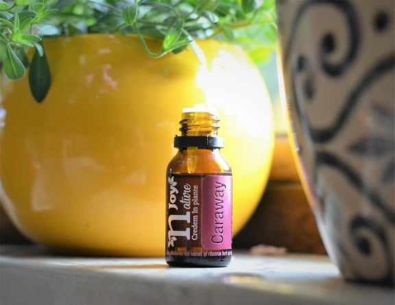 • Effect: carminative, astringent, antispasmodic, antiseptic, antimicrobial, disinfectant, antioxidant, dewormer, digestive, insecticide; offers a state of peace; strong antiseptic that treats acne, irritation or itching; powerful antioxidant that helps in case of wrinkles and aged skin, regenerating it, due to the high content of carvone; it is very helpful in case of toothache, back, belly.